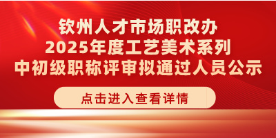 2025年度钦州市工艺美术系列中初级专业技术资格评审拟通过人员公示 发布时间:2025-12-03文章来源:钦州人才网访问次数:139次 根据《广西